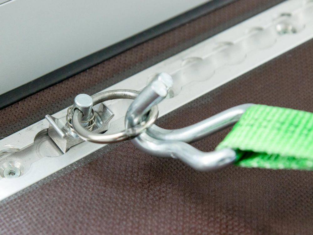 • seitlich links und rechts in Bodenplatte integrierte Airline-Zurrschiene inkl. 6 Stück frei versetzbaren Zurrringen