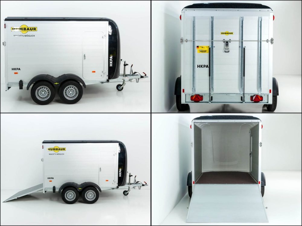 Aerodynamischer Tandem-Kofferanhänger in 2,6 t. mit Auffahrklappe hinten und zusätzlicher Seitentür (beide abschliessbar), feuerverzinktes Fahrgestell, leichter Aufbau aus Aluminium und GFK, Farbe: silber/anthrazit, 2 Airlineschienen serienmäßig