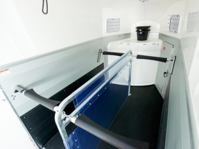 Die komfortable Innenausstattung des Humbaur XANTHOS ist optimal auf die Bedürfnisse von Pferd und Reiter zugeschnitten. Der großzügige Innenraum mit Beleuchtung und zwei Aufstellfenstern sorgt für angenehmes Licht zu jeder Tageszeit. Das zusätzliche Windschott stellt eine zugfreie Frischluftzufuhr im Pferdeanhänger sicher. Und eine durchdachte Sicherheitsausstattung kommt beim deutschen Hersteller Humbaur serienmäßig hinzu: Die gepolsterten Brust- und Heckstangen lassen sich dank Panikentriegelung sekundenschnell von außen lösen. Darüber hinaus schützen die verriegelbare Trennwand und der seitliche Trittschutz das Pferd vor Verletzungen während der Fahrt.