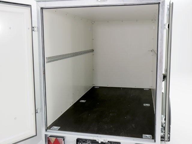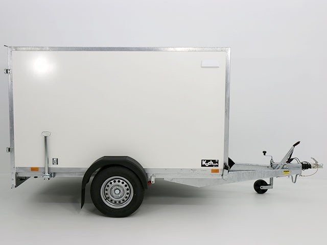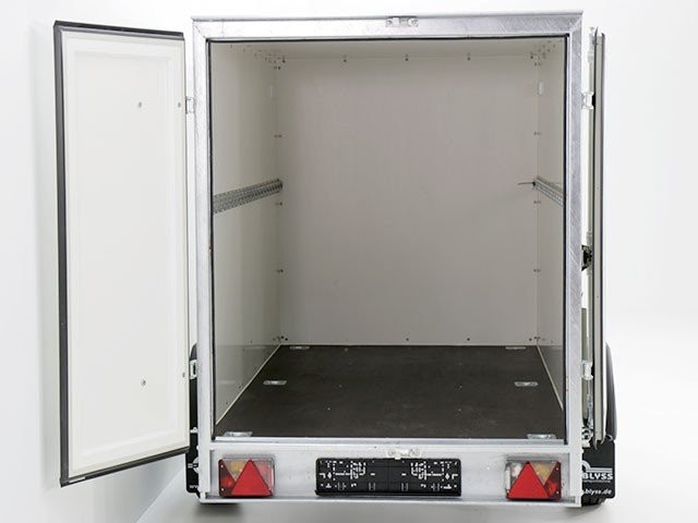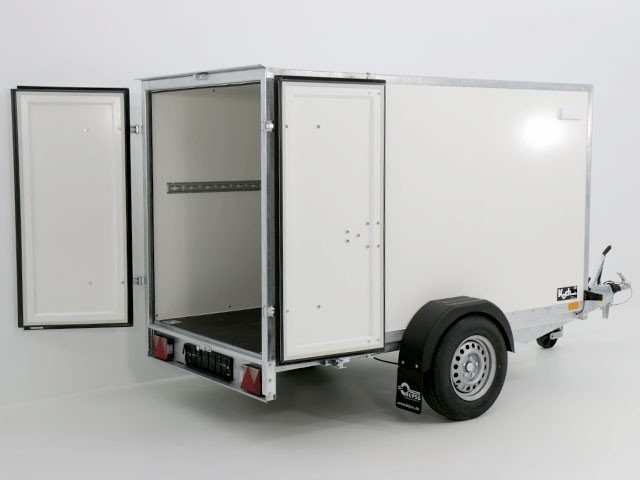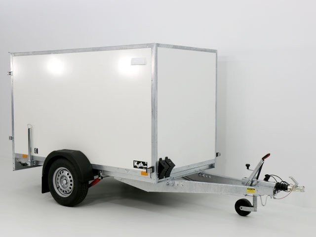 Solider weißer Koffer-Anhänger mit einem Lademaß von 130x264cm Innenhöhe150cm. Dieser Anhänger mit zuläßigem Gesamtgewicht von 1300kg und einer Nutzlast von ca. 805kg ist von der Marke Blyss.