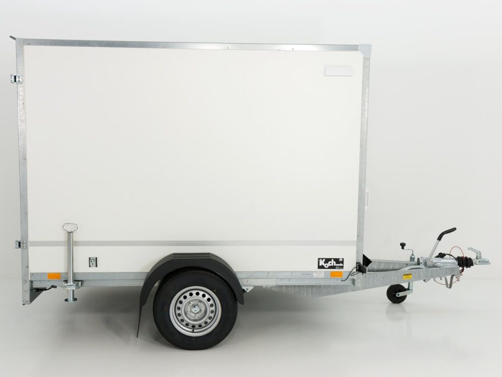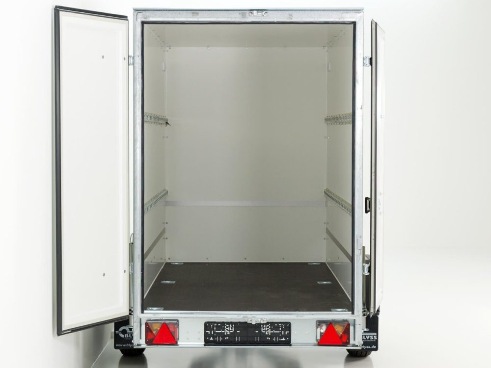 Solider weißer Koffer-Anhänger mit einem Lademaß von 130x264cm Innenhöhe180cm. Dieser Anhänger mit zuläßigem Gesamtgewicht von 1300kg und einer Nutzlast von ca. 745kg ist von der Marke Blyss.