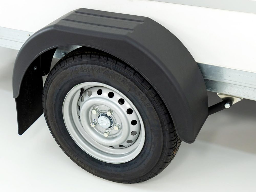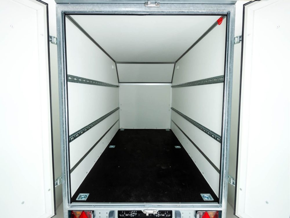 Solider weißer Koffer-Anhänger mit einem Lademaß von 146x304cm Innenhöhe180cm. Dieser Anhänger mit zuläßigem Gesamtgewicht von 1300kg und einer Nutzlast von ca.680 kg ist von der Marke Blyss.