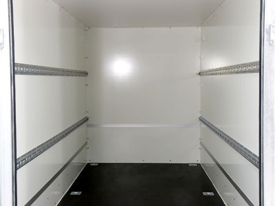 Solider weißer Koffer-Anhänger mit einem Lademaß von 146x304cm Innenhöhe180cm. Dieser Anhänger mit zuläßigem Gesamtgewicht von 2700kg und einer Nutzlast von ca.2020 kg ist von der Marke Blyss.