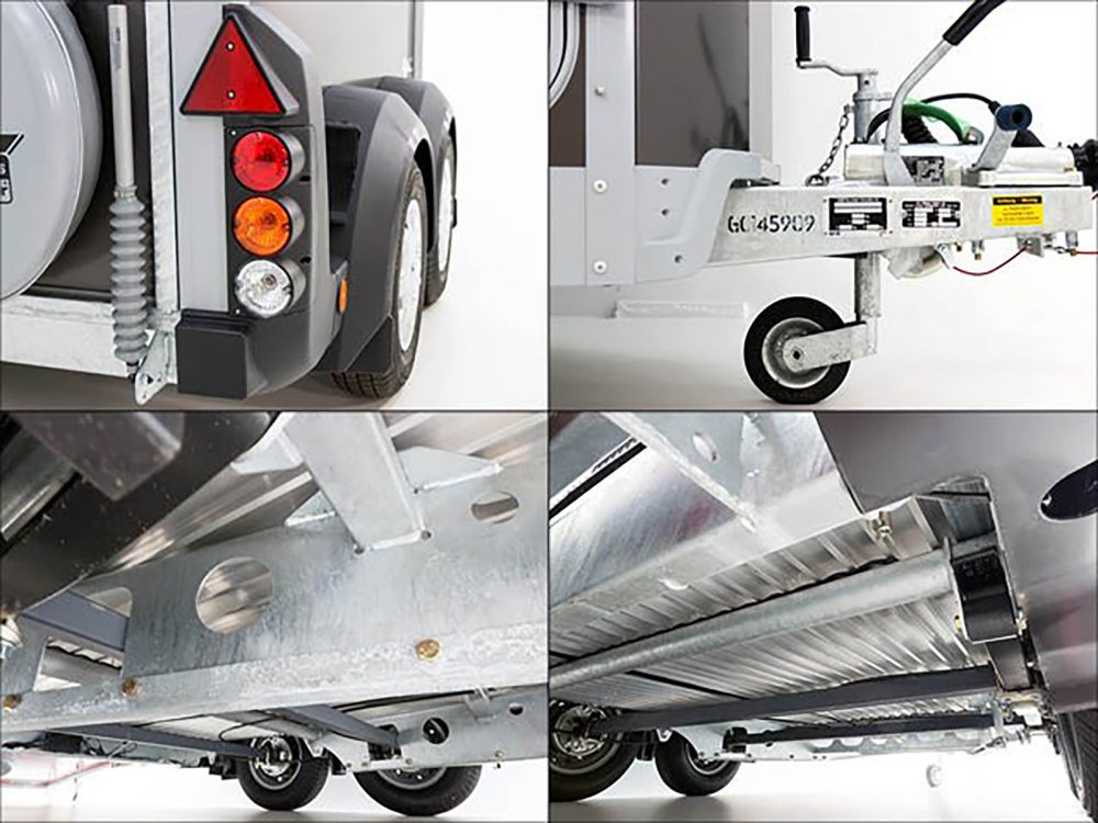 – Blattfedern | Verzinkte V-Deichsel mit Zugkugelkupplung | Stützrad | Rückfahrautomatik