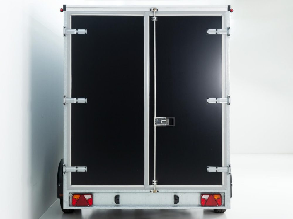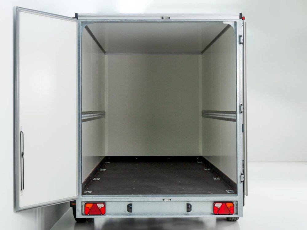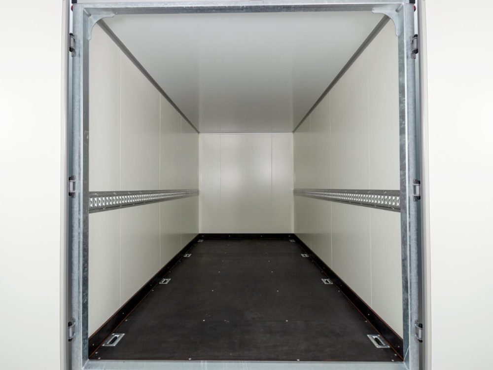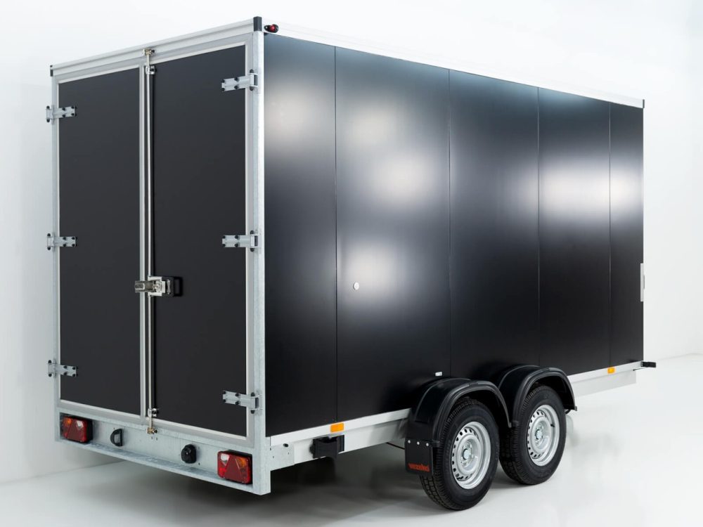 Koffer, Schwerlast- Automatikstützrad, Feuerverzinkung, Rückfahrautomatik, Gummifederachse, Auflaufbremse, NEUFAHRZEUG!, StahlblechSandwich Koffer 30mm, Dach GFK Sandwich 25mm, Außen schwarz und innen weiß, Heckrahmen und Einfaßprofile aus spezial Aluminiumprofilen, Edelstahl-Drehstangenverschluß an doppelflügeliger Hecktüre, verschließbar, 6 Zurrösen im Bodenplatte, Beleuchtung mit 13 pol Stecker, Anhänger verfügt beidseitig über Zurrleiste Alu !, Herstellergarantie ! Tempo 100 km/h gegen Aufpreis möglich