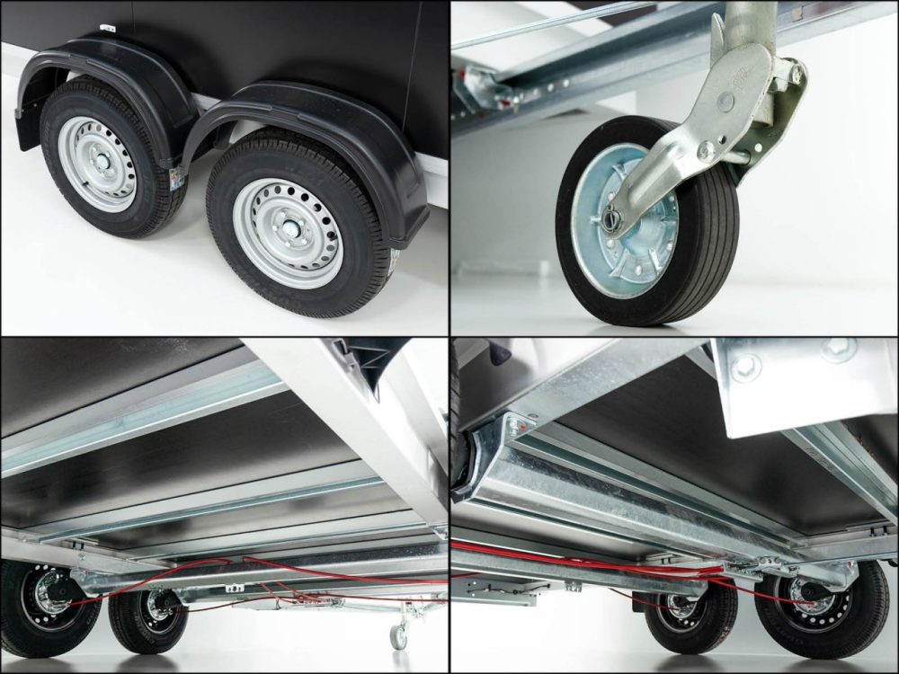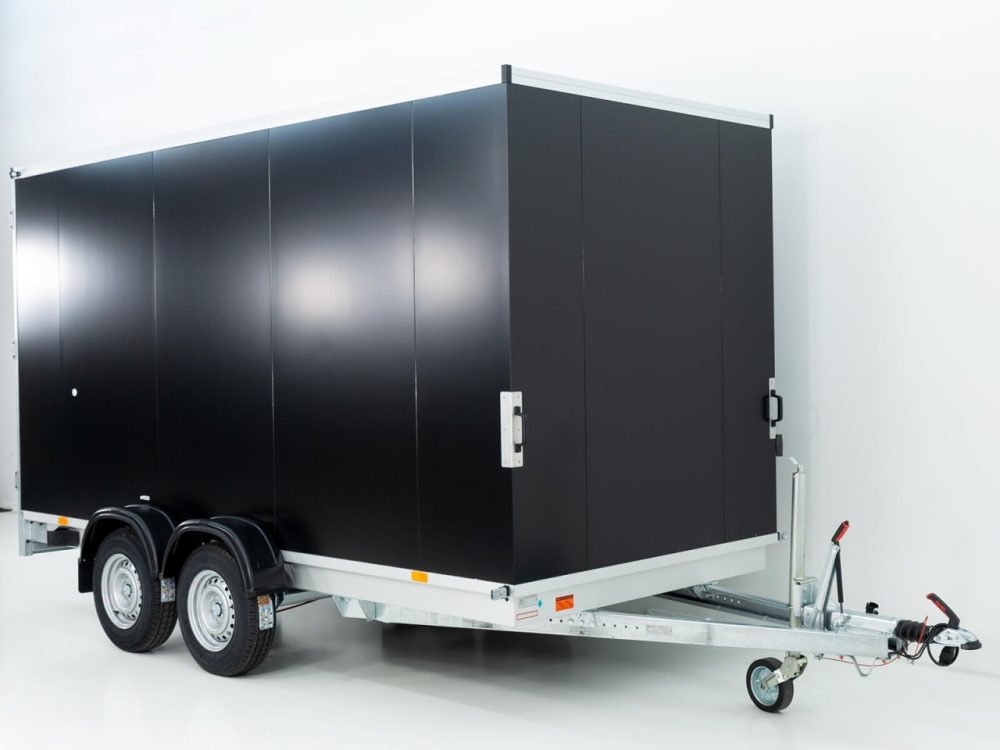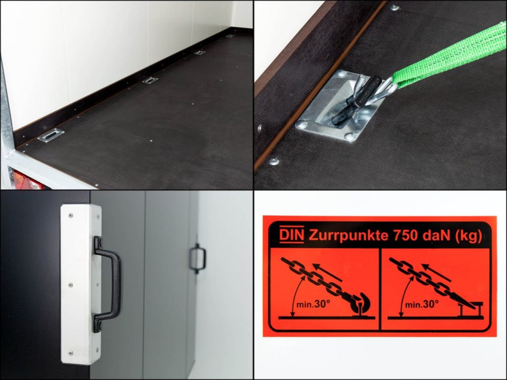 Koffer, Schwerlast- Automatikstützrad, Feuerverzinkung, Rückfahrautomatik, Gummifederachse, Auflaufbremse, NEUFAHRZEUG!, StahlblechSandwich Koffer 30mm, Dach GFK Sandwich 25mm, Außen schwarz oder silber und innen weiß, Heckrahmen und Einfaßprofile aus spezial Aluminiumprofilen, Edelstahl-Drehstangenverschluß an doppelflügeliger Hecktüre, verschließbar, 8 Zurrösen im Bodenplatte, Beleuchtung mit 13 pol Stecker, Anhänger verfügt beidseitig über Zurrleiste Alu !, Herstellergarantie ! Tempo 100 km/h gegen Aufpreis möglich