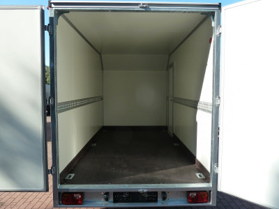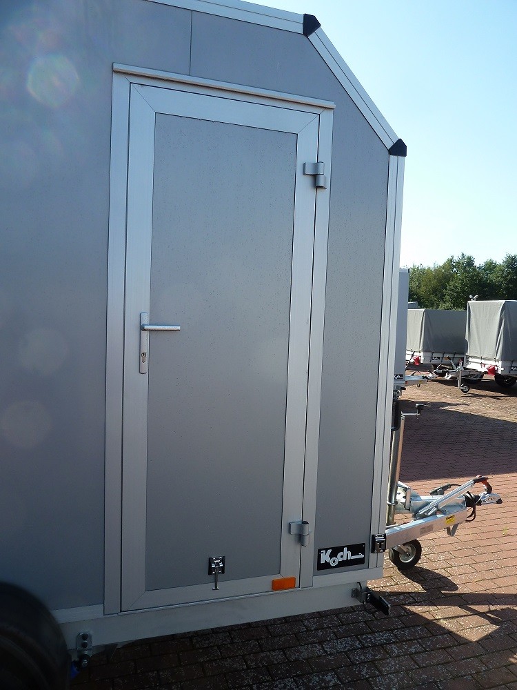 Koffer, Schwerlast- Automatikstützrad, Feuerverzinkung, Rückfahrautomatik, Gummifederachse, Auflaufbremse, NEUFAHRZEUG!, StahlblechSandwich Koffer 30mm, Dach GFK Sandwich 25mm, Außen silber (schwarz oder weiss ist auch möglich) und innen weiß, Heckrahmen und Einfaßprofile aus spezial Aluminiumprofilen, Edelstahl-Drehstangenverschluß an doppelflügeliger Hecktüre, verschließbar, 6 Zurrösen in Bodenplatte, Beleuchtung mit 13 pol Stecker, Anhänger verfügt beidseitig über Zurrleiste Alu !, Herstellergarantie ! Tempo 100 km/h gegen Aufpreis möglich